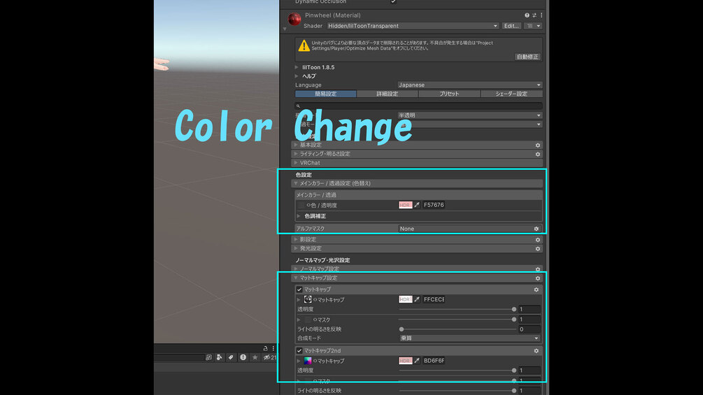 To change the color, open the Material section at the bottom of the Inspector in Unity and adjust the color settings or matte cap settings as shown in the images.