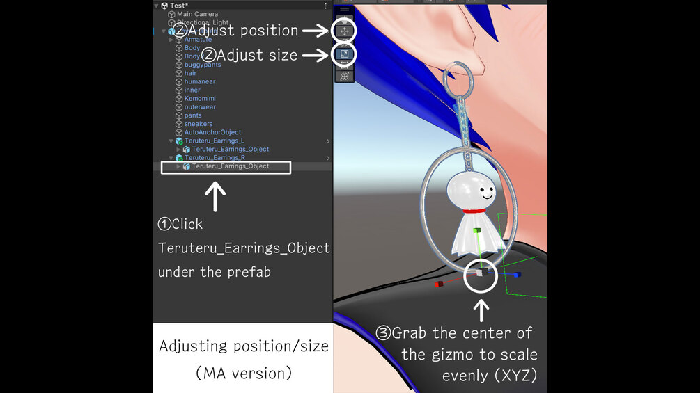 3. In the Hierarchy, click Teruteru_Earrings_Object under the prefab to adjust position and scale. Copy the transform to the other earring and invert the X position (see image).