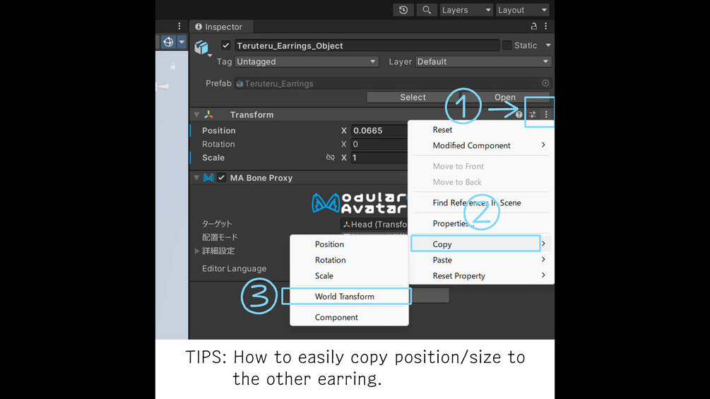 • To copy position/scale to the other ear: in the Inspector, click the three-dot menu (Context Menu) on the right side of the Transform → Copy → World Transform.