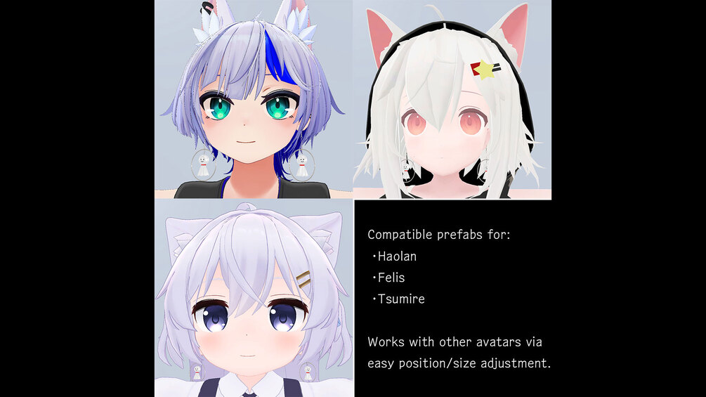 They come with Modular Avatar settings and can be easily adjusted to fit many avatars by tweaking the position and size. You can also toggle them ON/OFF via the EX menu.